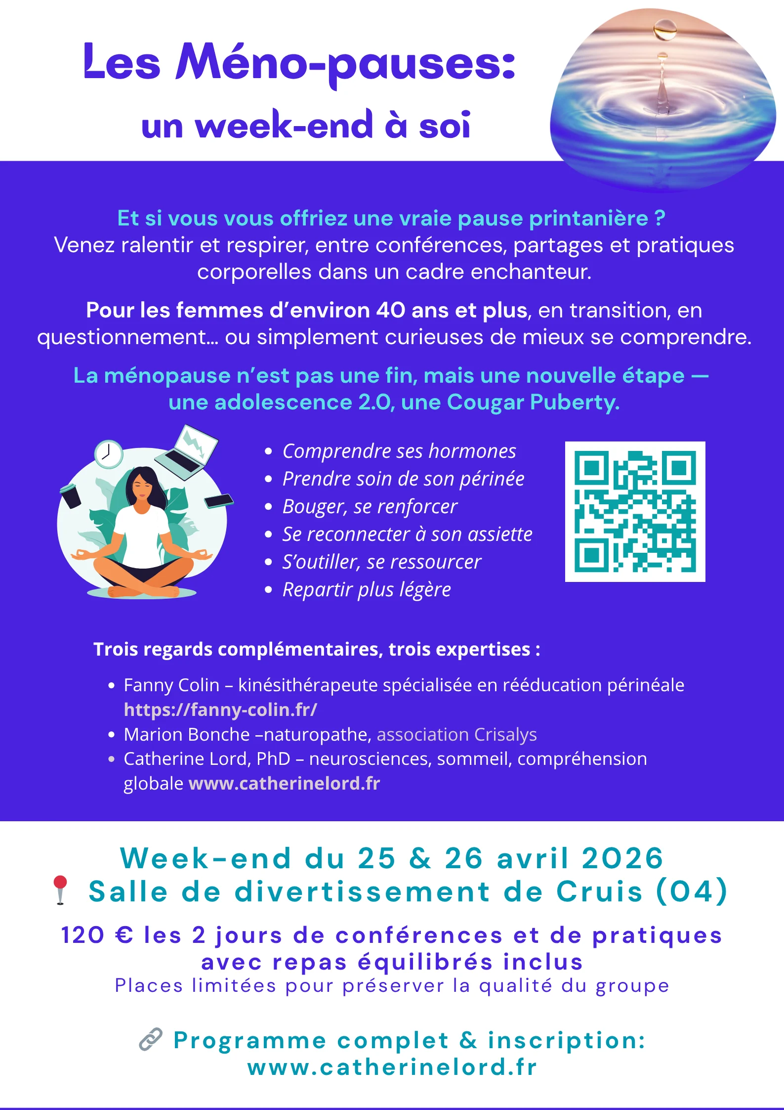 Je suis Catherine Lord, titulaire d’un doctorat en neurosciences (Ph.D.) de l’Université McGill de Montréal, Canada. Spécialisée dans le sommeil à tous les âges, le développement de l’enfant, la santé mentale et la ménopause, j’adore apprendre, comprendre et partager.